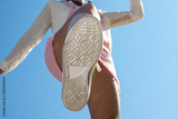 Bottom view of shoe sole, Bottom view boot sole of woman jumping with a blue sky background. Bottom view of woman jumping over the camera and close-up of the sole of the boot