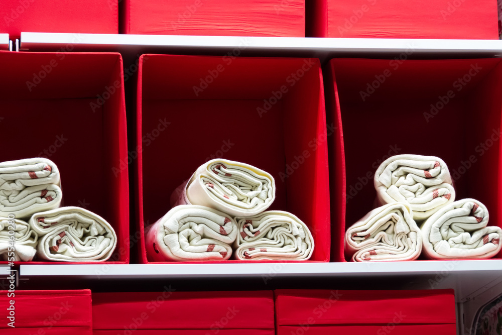 White towels in red boxes on store shelves.