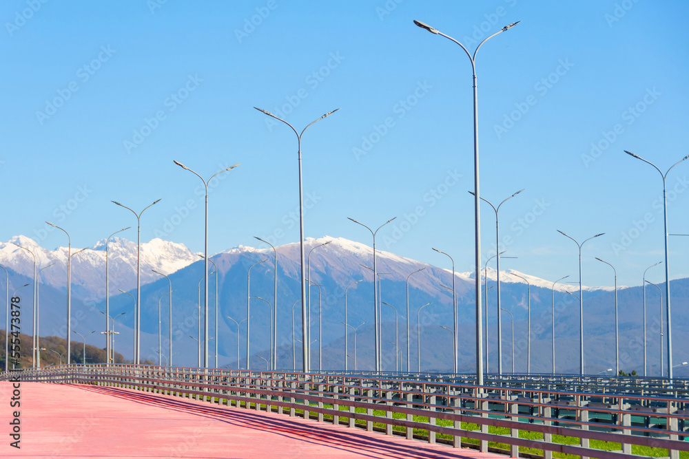 Outdoor tables with lanterns on a landscaped city street, in the background a mountain landscape with forests on the slopes and snow and glaciers on the peaks.