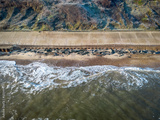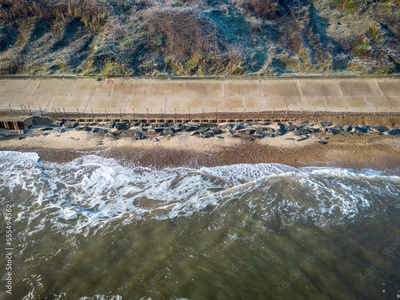 Drone view of waves hitting a sea defence system on the UK coast line. The distant cliffs leads to a holiday resort.