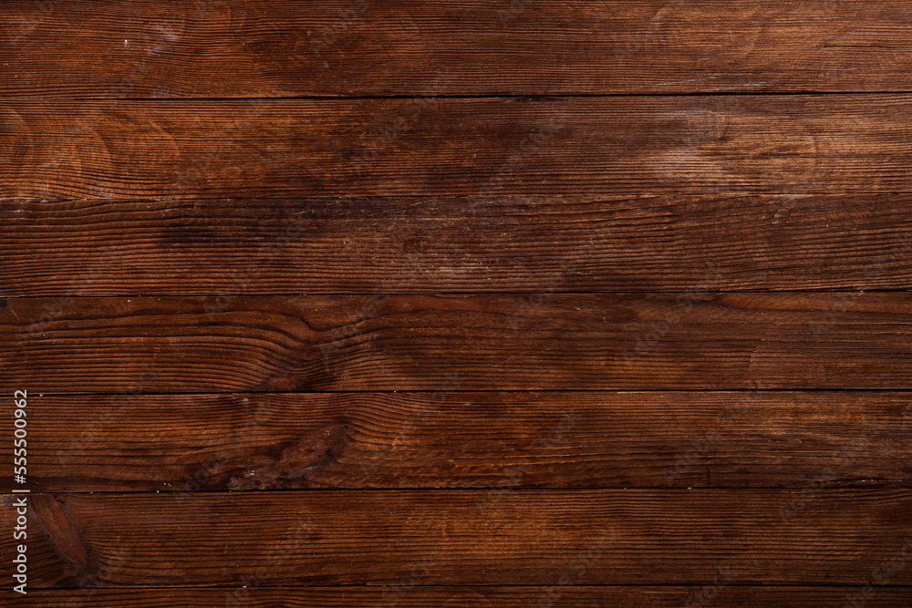 Vintage brown wood background texture with knots and nail holes. Old painted wood wall. Brown abstract background. Vintage wooden dark horizontal boards.
