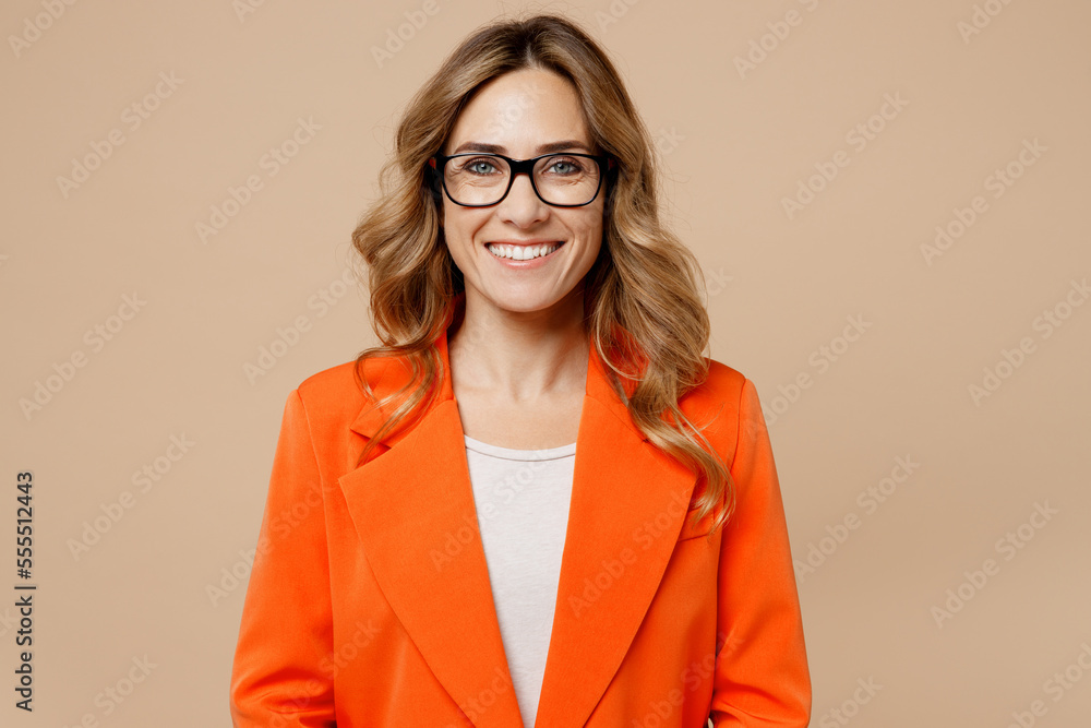 Close up young fun happy successful employee business woman corporate lawyer 30s wearing classic formal orange suit glasses work in office look camera isolated on plain beige color background studio.