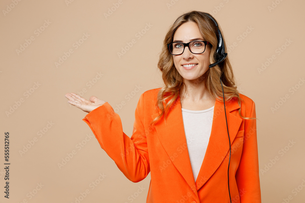 Young employee operator business woman wears set microphone headset for helpline assistance work at call center office look camera point hand aside on area isolated on plain beige background studio.