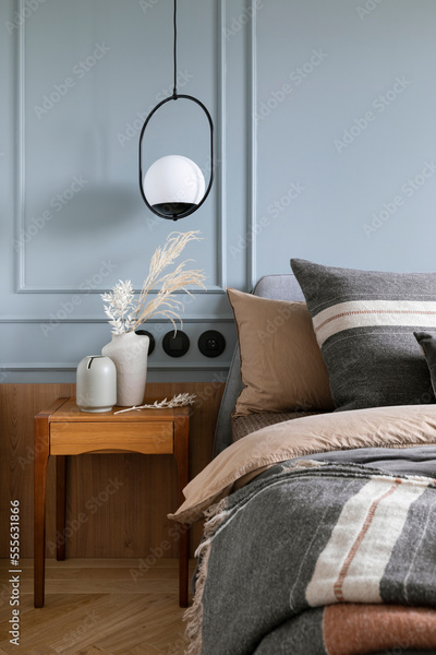 Creative composition of bedroom interior with brown and grey bedding, pillows, bedside table, vase with dried flowers, sculpture , hanging lamp and personal accessories. Home decor. Template.