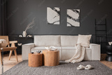 Elegant composition of living room interior with mock up poster frame, beige modular sofa, wooden coffee table, slippers, rattan armchair, braided plaid and personal accessories. Home decor. Template.