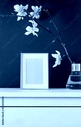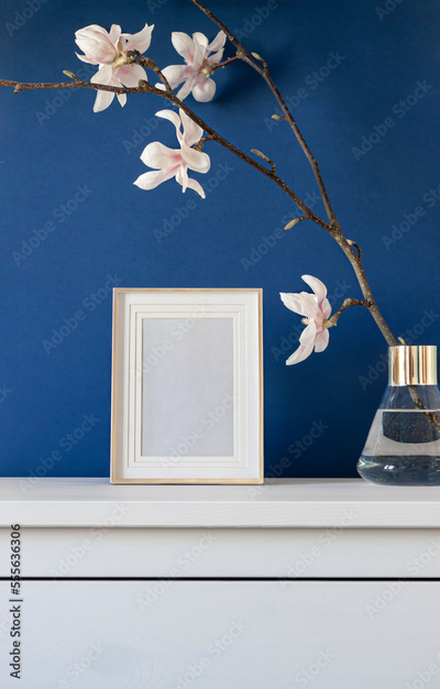 Empty photo frame on the white wooden dresser on the blue background with magnolia flower branch in vase. Copy space