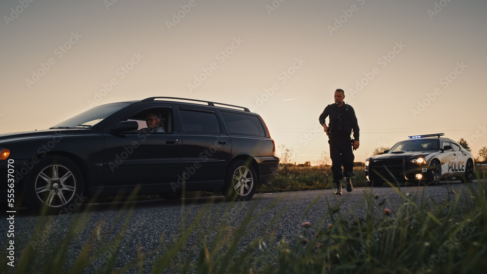 Speeding Driver Gets Pulled Over By Police Patrolling Car . Wide Shot of the Two Cars Stopped in a Road Crossing and Officer Walking Towards Suspect. Drunk Driver Gets Caught by Professional Cop