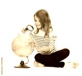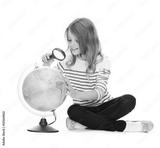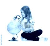 child looking at globe with magnifier