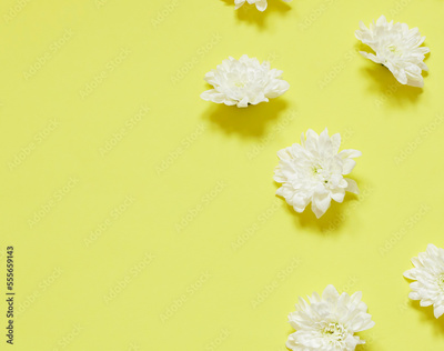 White chrysanthemum flowers frame on the yellow background. Copy space