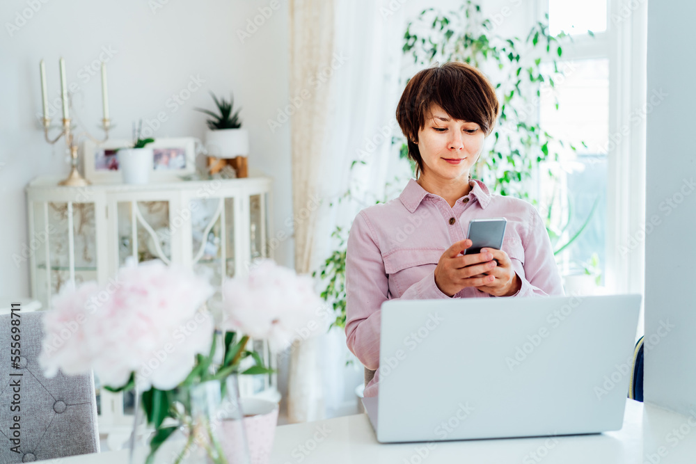Woman with laptop using phone while relaxing at home during break. Cozy workspace with fresh peony flowers and cup of hot drink on the white table with light interior background. Remote work.