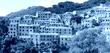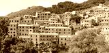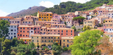 Panorama of city Rio nel Elba with colorful houses and mountains.