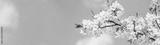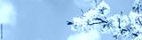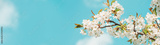 Cherry blossom branch against the blue sky. Morning outdoors. Web banner with copy space.