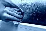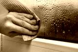 high humidity in the house. hand wipes off water condensation from plastic window glass in the room
