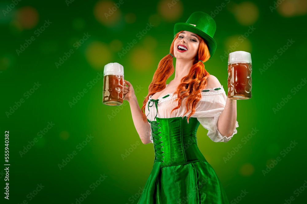 Happy Irish girl holding big mugs with beer or ale. Young red-haired woman аs green Leprechaun elf character for advertising. St. Patrick's Day party. Ireland National Independence Day March 17th