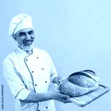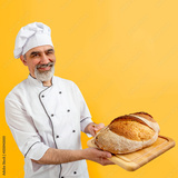 Chef-cooker in chef's hat and jacket working in bakery, holding French bread board with bread. Senior professional baker man wearing chef's outfit. Character kitchener, pastry chef for advertising
