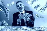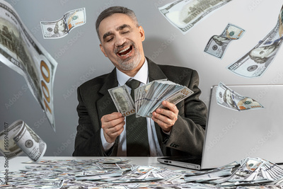 Million-dollar rain concept. Businessman with laptop sitting at the table in the office near the gray wall. Adult man wearing formal suit with a tie
