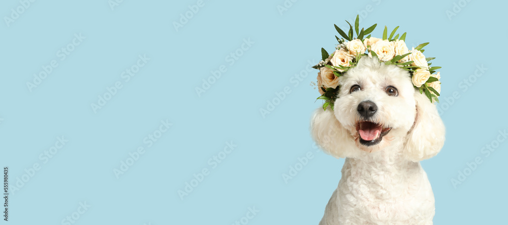 Happy pet. Cute Bichon dog with wreath of flowers smiling on pale light blue background, space for text. Banner design