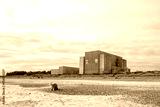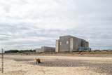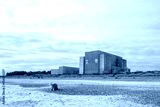 Poodle dog seen wandering on a Suffolk beach seen near a large, de-commissioned magnox nuclear power plant. The large beach of the Suffolk coast is void of people.