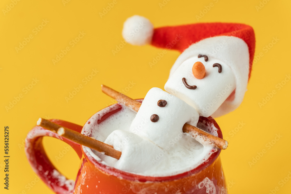 Marshmallow snowman taking hot tub in a red ceramic cup full of cocoa with milk foam. Christmas holidays yellow background. Wintertime concept. Hot chocolate with marshmallow and festive decoration.