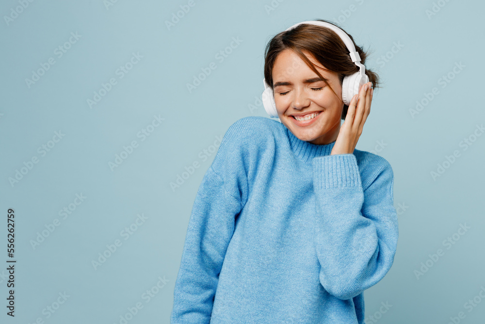 Young satisfied fun woman wear knitted sweater headphones listen to music raise up hands dance close eyes isolated on plain pastel light blue cyan background studio portrait. People lifestyle concept.