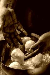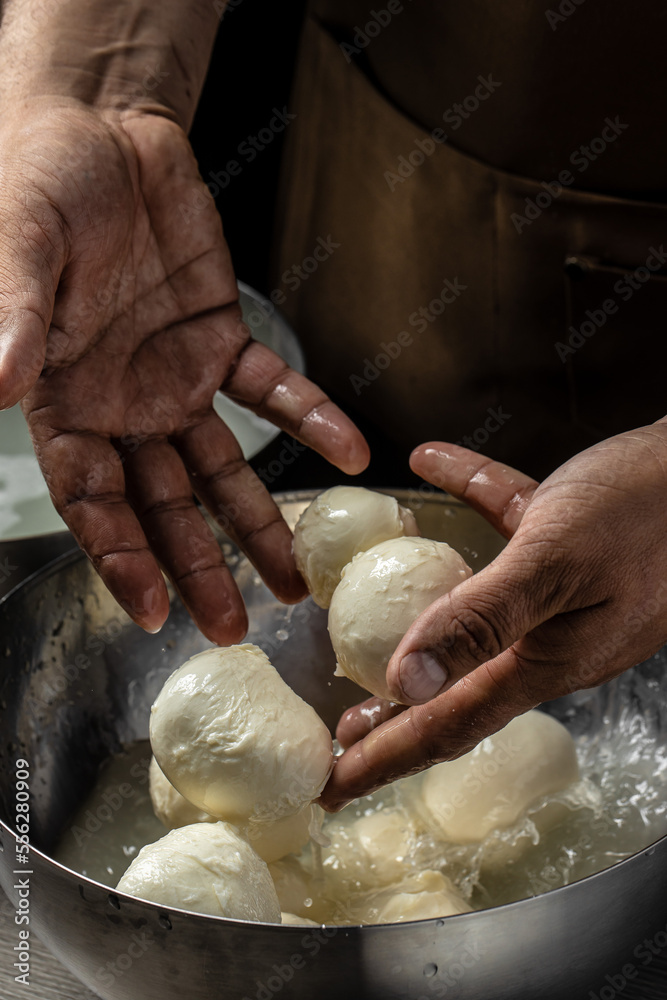 A man working in a small family creamery is processing the final steps of making a cheese. Italian hard cheese silano or caciocavallo, mozzarella