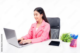 Young Asian business woman working on laptop computer at office isolated on white background Beautiful business young adult female in pink suit using laptop computer sit on desk in office with happy