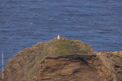 Great rock off the coast of the town of Porto Moniz in Madeira, Portugal. There is also a small lighthouse on the rock.