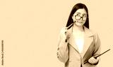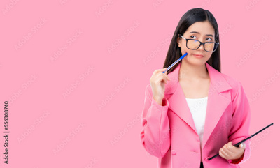 Young asian business woman company worker wear glasses Thinking female holding digital tablet Beautiful lady standing over pink background Businesswomen wear pink suit She thinking and looking up