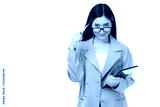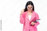 Young asian business woman company worker wear glasses Happy smiling female holding digital tablet .Beautiful lady standing over white background .Businesswomen wear pink suit She thiking out of box