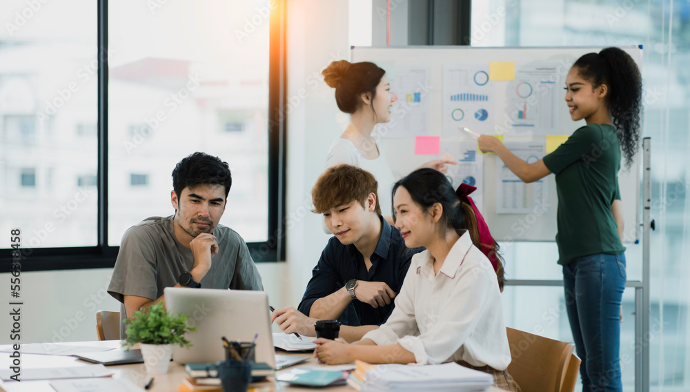 Technology and financial advisory services concert. Business teamwork and working on digital laptop computer with advisor showing plan of investment to clients at table office. Digital marketing.