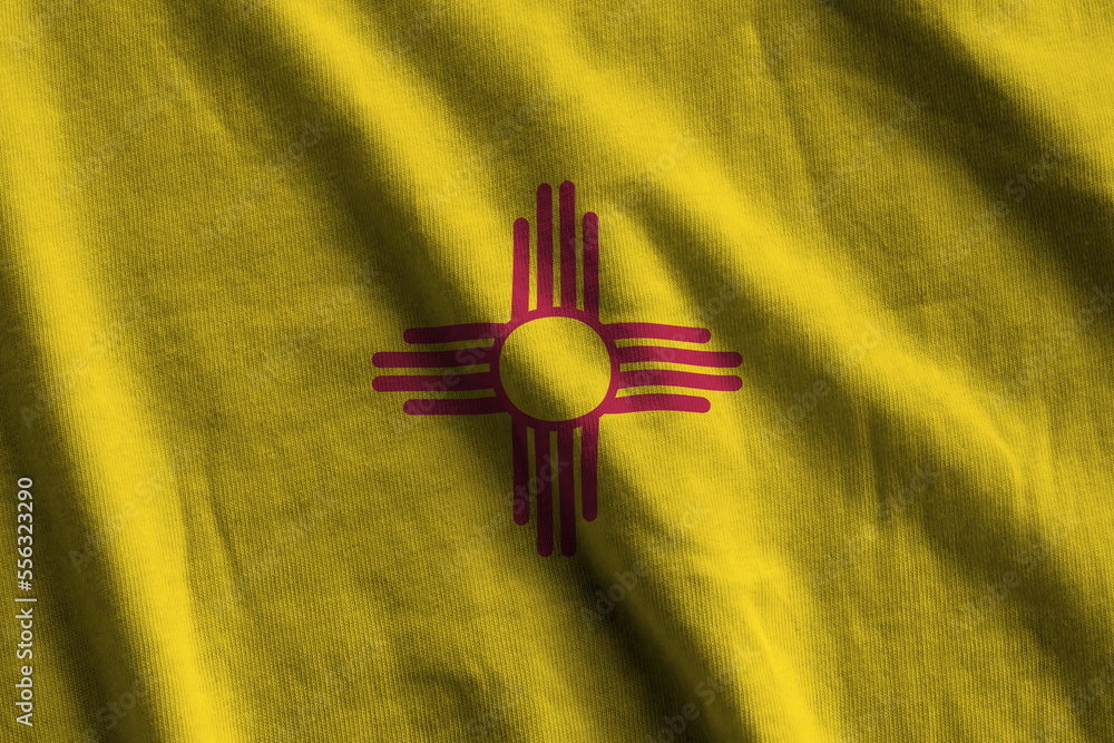 New Mexico US state flag with big folds waving close up under the studio light indoors. The official symbols and colors in fabric banner