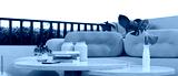 Modern beautiful restaurant outdoor seating space with comfortable sofa, coffee table and decor.