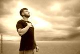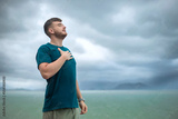 happy handsome free guy, young calm relaxed carefree man traveler with open raised hands enjoy sea, ocean view, person feeling good, breath deep deeply fresh air. Freedom, travel, happiness concept