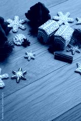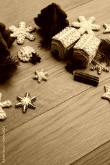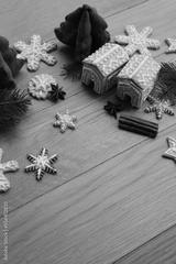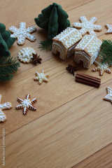 Small Gingerbread houses with many gingerbread cookies in shape of stars and snowflake on wooden table with pine branches, cinnamon and star anise spices on selective fcous