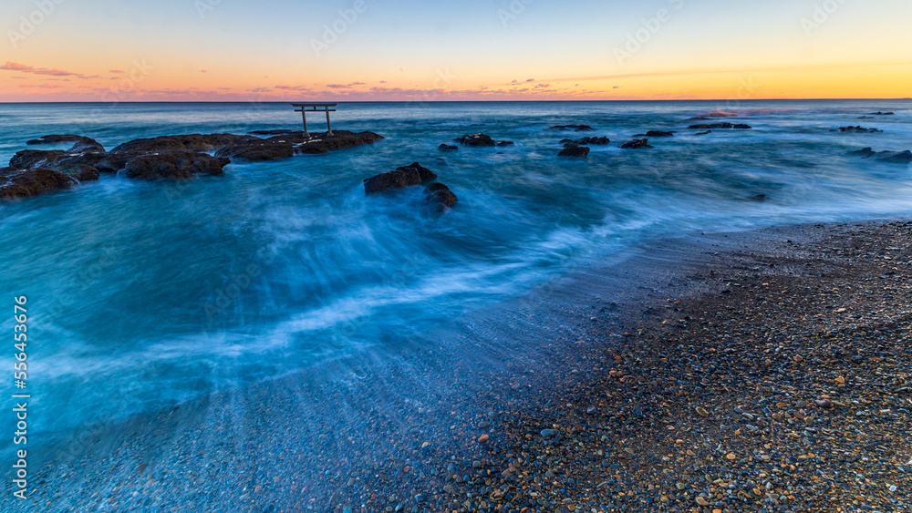 神磯の鳥居 波と海岸 夕焼け 絶景