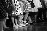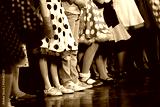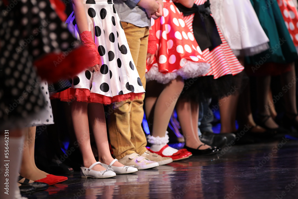 A group of children of small artists a boy and girls in bright colorful dresses stand on the stage in a row