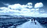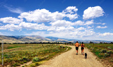 Couple and dog jogging on the Eagle Trail, Boulder, Colorado
