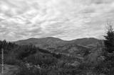 Autumn landscape with colorful trees, village on a hillside in a valley and mountains. Ukrainian Carpathians in the fall