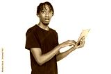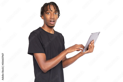 Surprised young man using digital tablet. Male African American model with brown eyes and afro braids in casual clothes opening mouth from shock using pad technology device. Modern technology concept