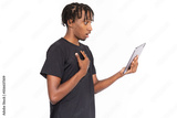 Shocked man watching video on digital tablet. Male African American model with brown eyes and afro braids in casual clothes opening mouth from amazement using pad technology device. Surprise concept