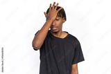 Surprised young man facepalm. Male African American model with brown eyes and afro braids in black T-shirt looking disappointed forgetting something, blaming himself for mistake. Bad memory concept