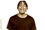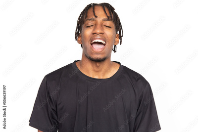 Portrait of emotional young man. Male African American model with brown eyes and afro braids in black T-shirt opening his mouth laughing, shouting with closed eyes. Emotion, facial expression concept