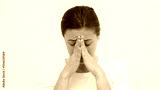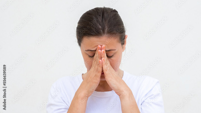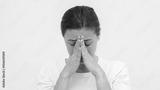 Portrait of stressed young woman rubbing nose over white background. Caucasian woman wearing white T-shirt crying or suffering from headache. Stress and depression concept