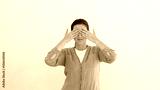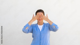 Portrait of young woman covering eyes with hands over white background. Caucasian woman wearing white T-shirt and jeans shirt waiting for surprise. Anticipation concept
