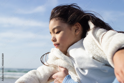 Happy little girl in white coat on beach. Japanese child on beach on summer day. Childhood, portrait, happiness concept