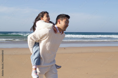 Joyful Japanese family together on sunny day. Father and daughter playing, riding on back, fooling around. Leisure, family time, parenting concept