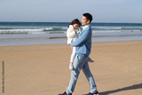 Happy father and daughter spending time on beach. Japanese family walking, hugging, dad carrying little girl. leisure, family time, parenting concept