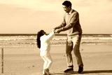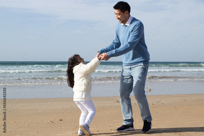 Merry Asian family walking together on beach. Father and daughter in casual clothes dancing near water and laughing. Togetherness, love, parenting concept