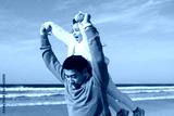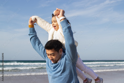 Happy Japanese family spending time on beach. Father and daughter playing, laughing, riding on back, fooling around. Leisure, family time, parenting concept