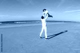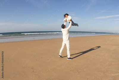 Fond father and daughter playing on beach. Japanese family on sunny day, lifting child up, laughing. Dad leisure, family time, parenting concept